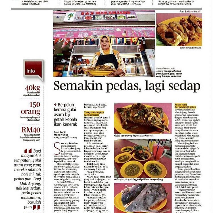 Jika anda kaki makan pedas, anda boleh berkunjung ke pekan Jerantut di Pahang dan mencuba menu tradisional iaitu gulai asam rom kepala ikan kenerak. Restoran Z & Z Mak Anjang adalah salah satu tempat yang menyajikannya, dan pastinya berbaloi untuk dicuba! Z & Z Mak Anjang telah beberapa kali diwawancara oleh pihak media seperti TV3 dan Utusan serta sering menjadi pilihan orang ramai yang berkunjung ke Jerantut termasuk selebriti dan pemimpin tempatan. Kepada mereka yang meminati juadah selera kampung dijemput untuk mencuba. Terdapat pelbagai jenis ikan sungai, ulam-ulaman dan juga lauk pauk lain disediakan seperti gulai tempoyak, ikan krai masak bawang putih goreng, ayam masak kicap dan gulai lemak putih.